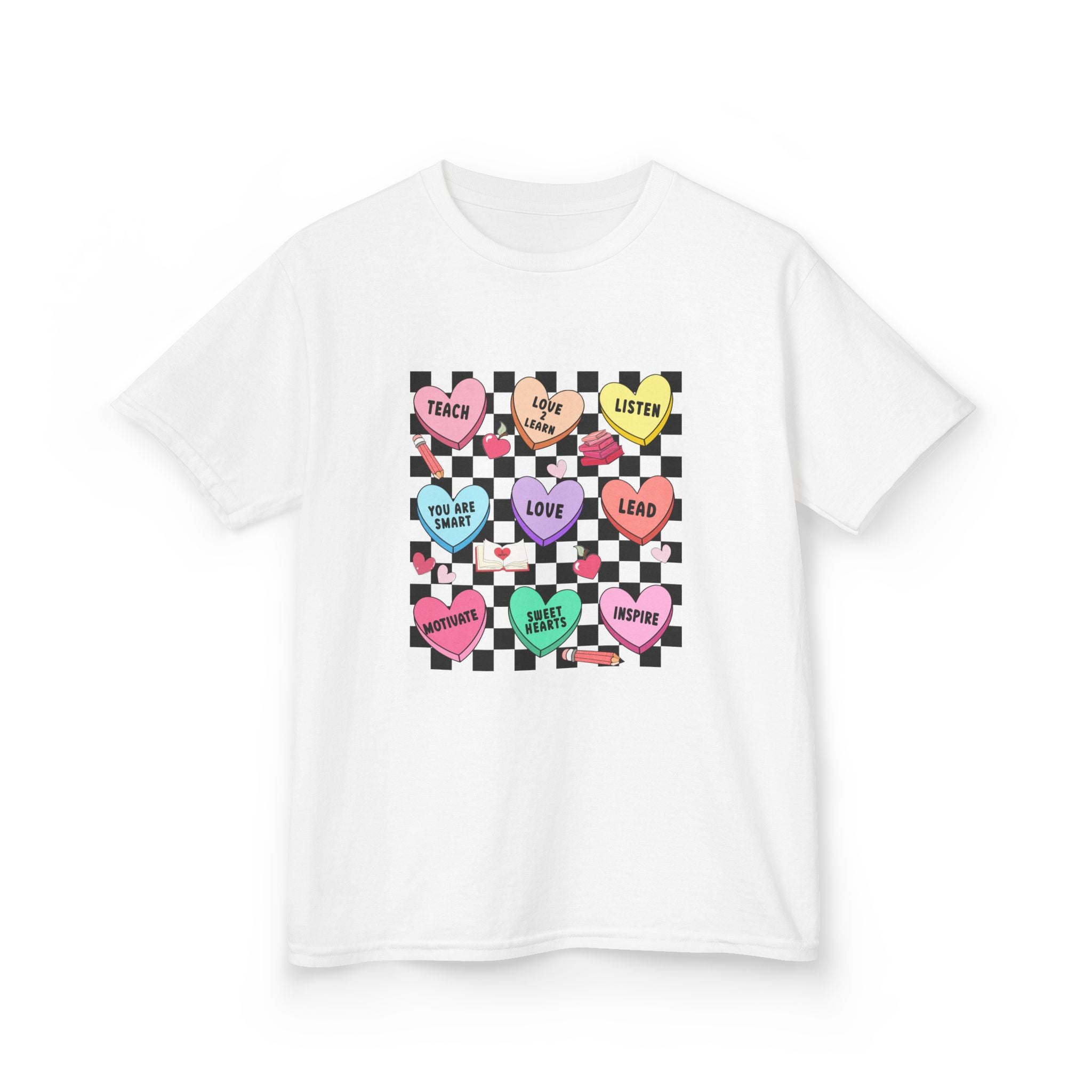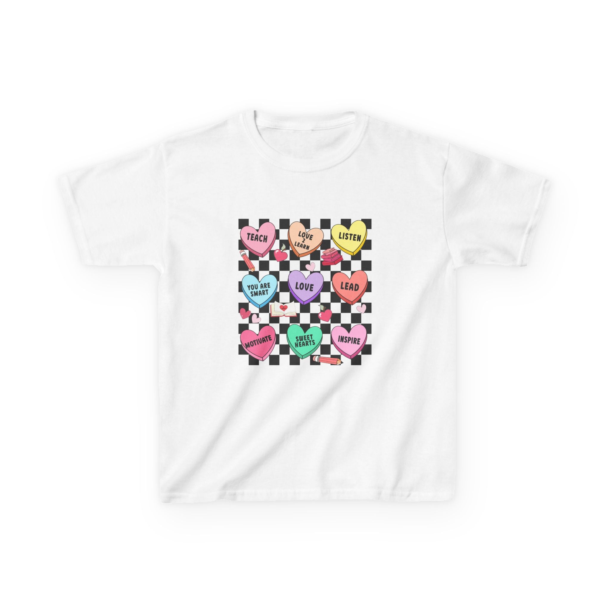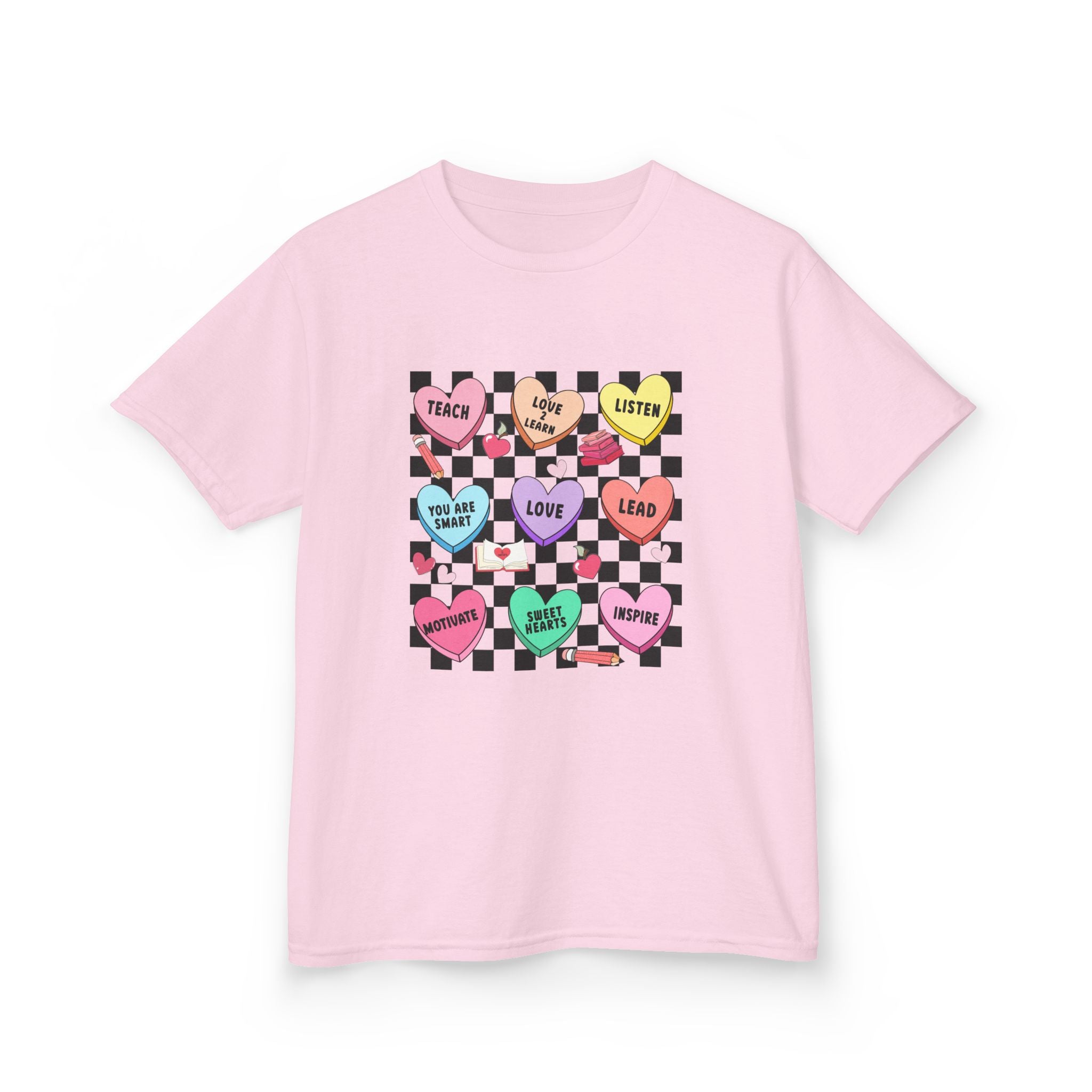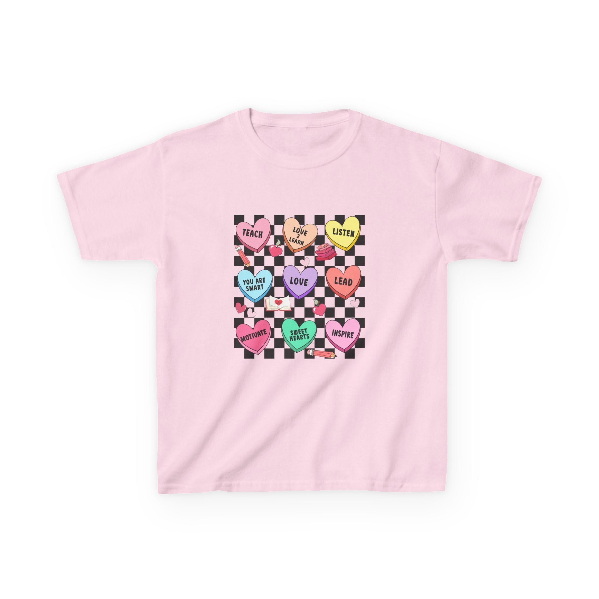 Candy Heart Checkerboard Kids T-Shirt | Pastel Hearts Words