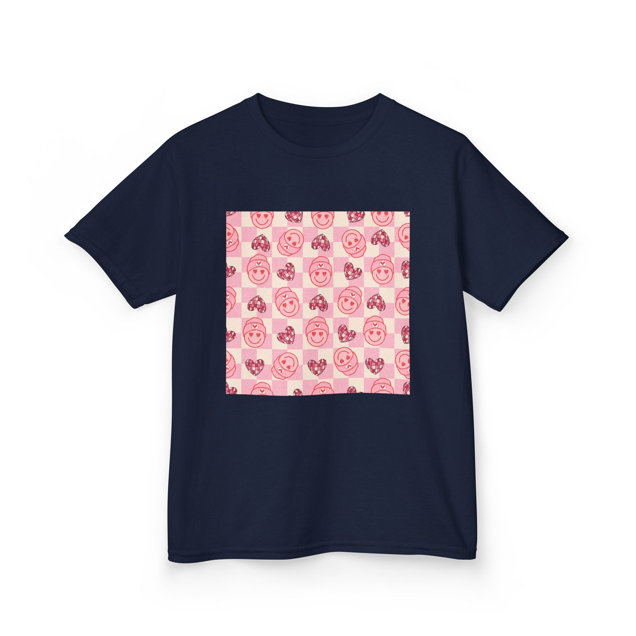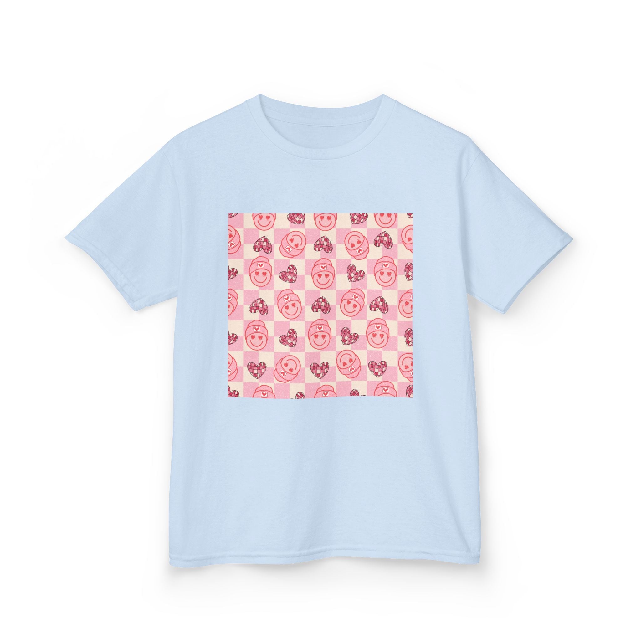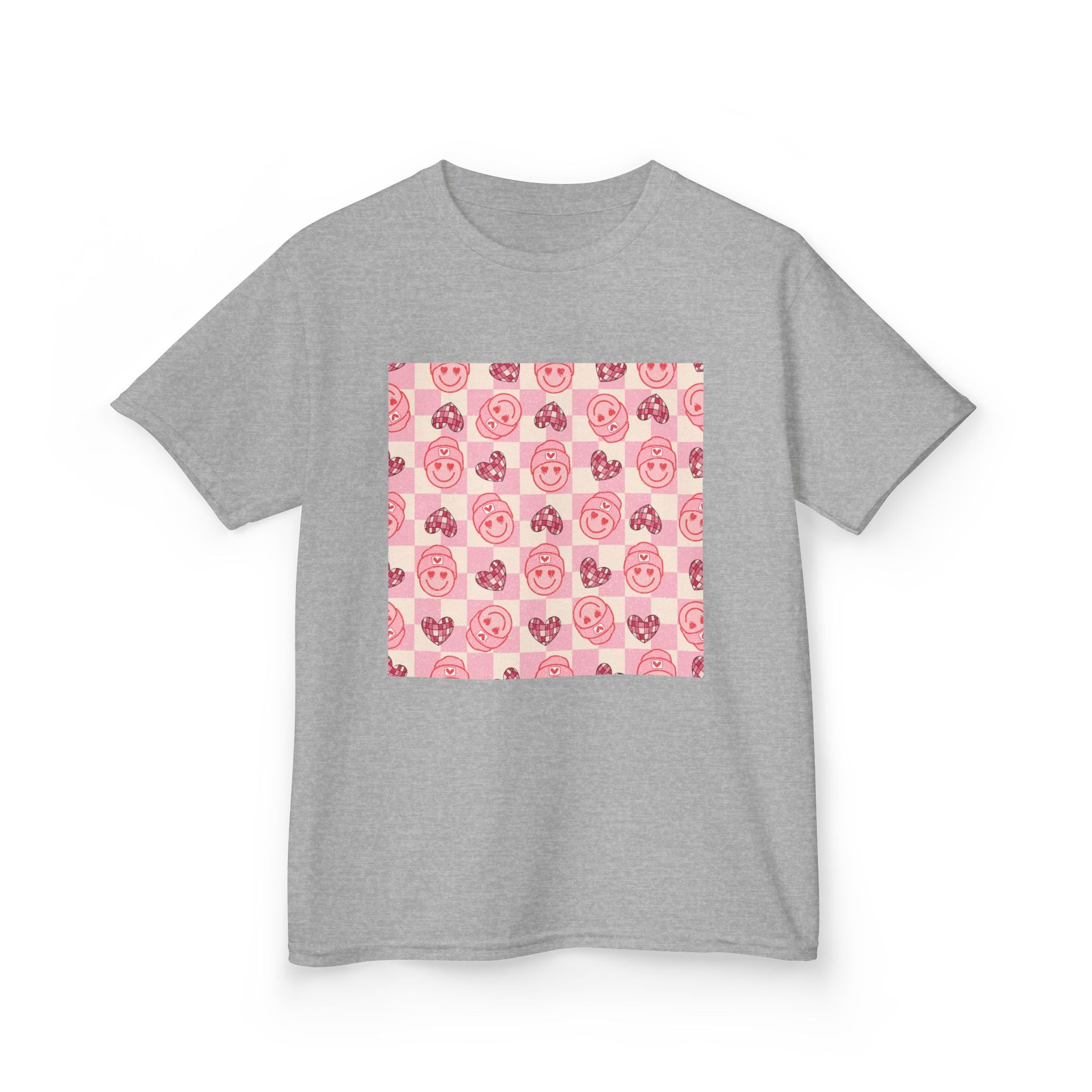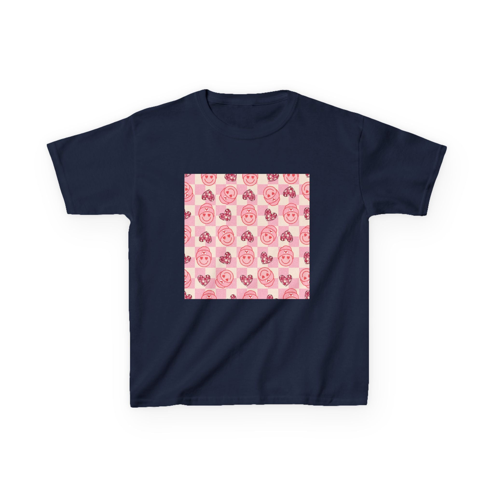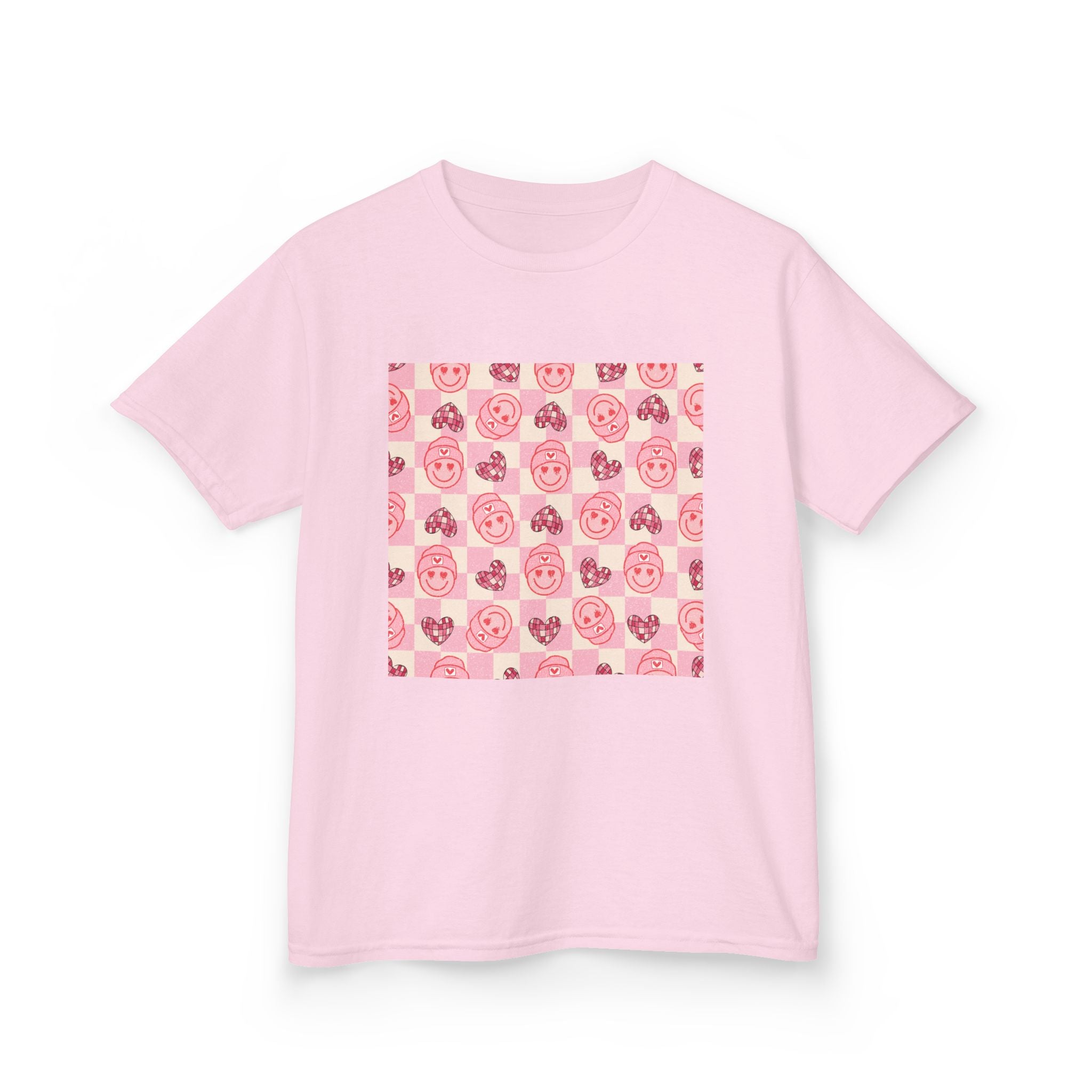 Soft, breathable tee printed with a cheerful, hand-drawn pattern of smiling roses in warm pinks. Lightweight midweight cotton sits comfortably on little shoulders and holds its shape through play. The square print sits on the chest like a tiny gallery — playful, bright, and quietly confident. Kids wear this when they want to bring color to a day at preschool, a neighborhood picnic, or slow afternoons of drawing and storytime. The fabric feels gentle against sensitive skin and the ribbed neckline keeps its shape wash after wash. Ethically sourced cotton and clean, REACH-certified materials mean parents can feel good about how it’s made.