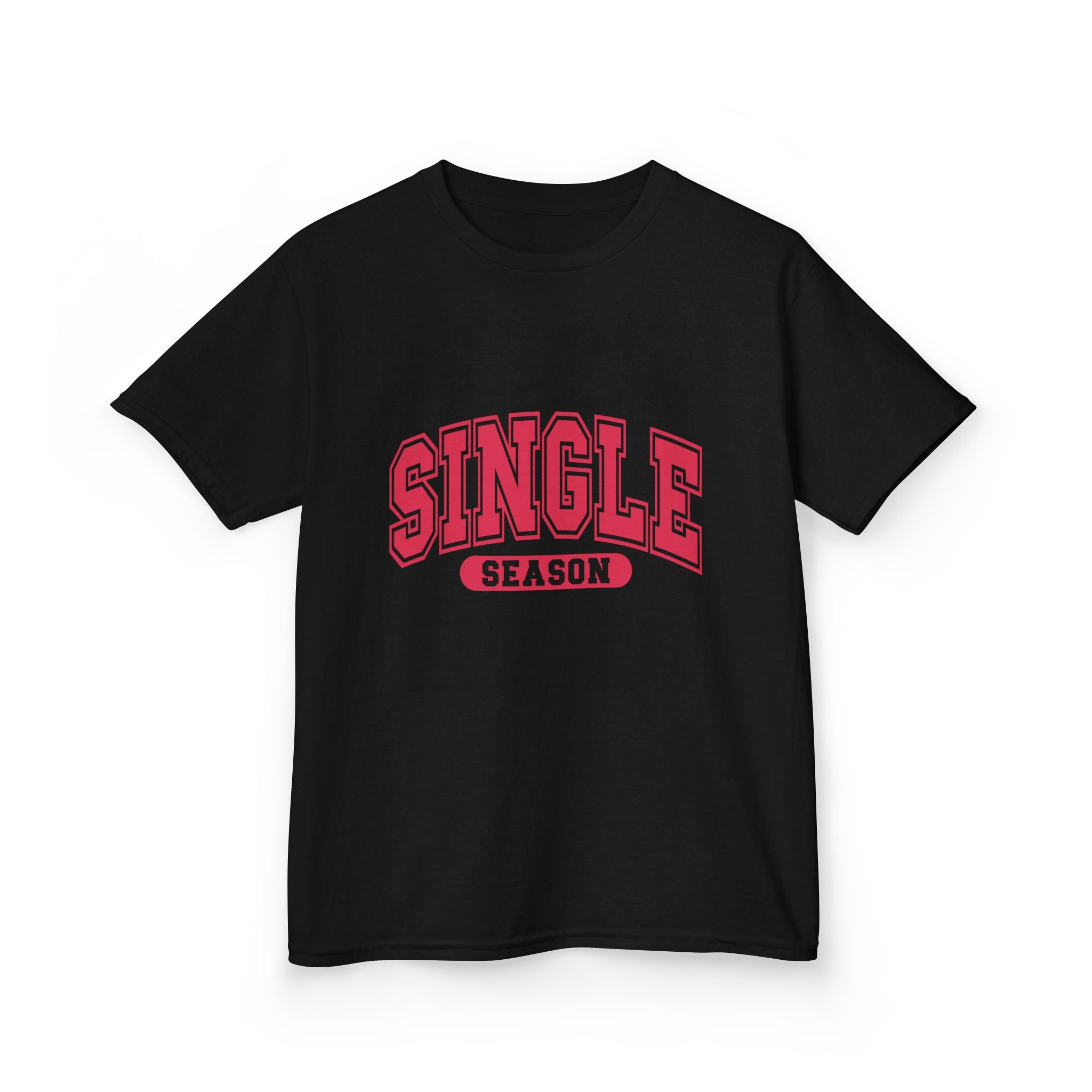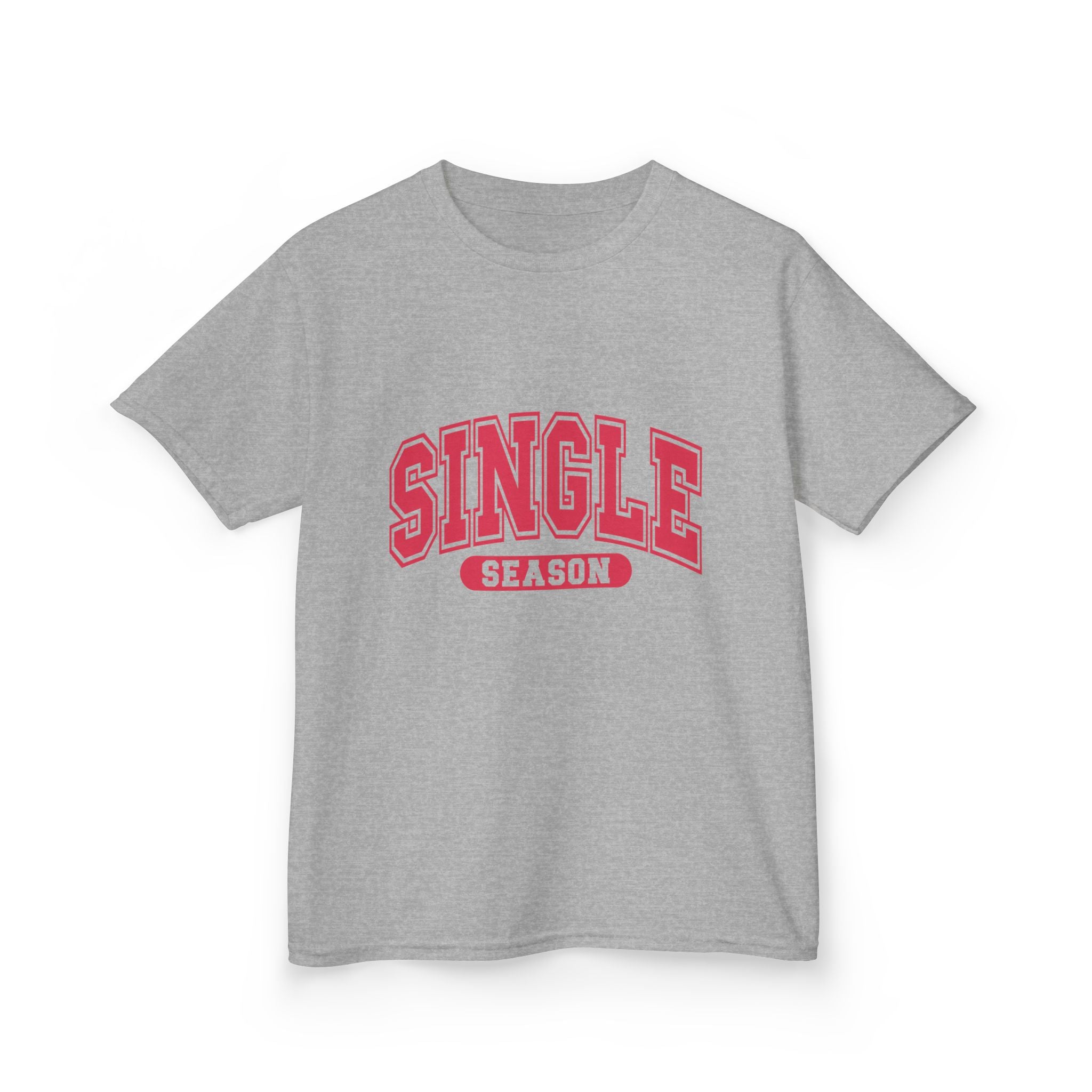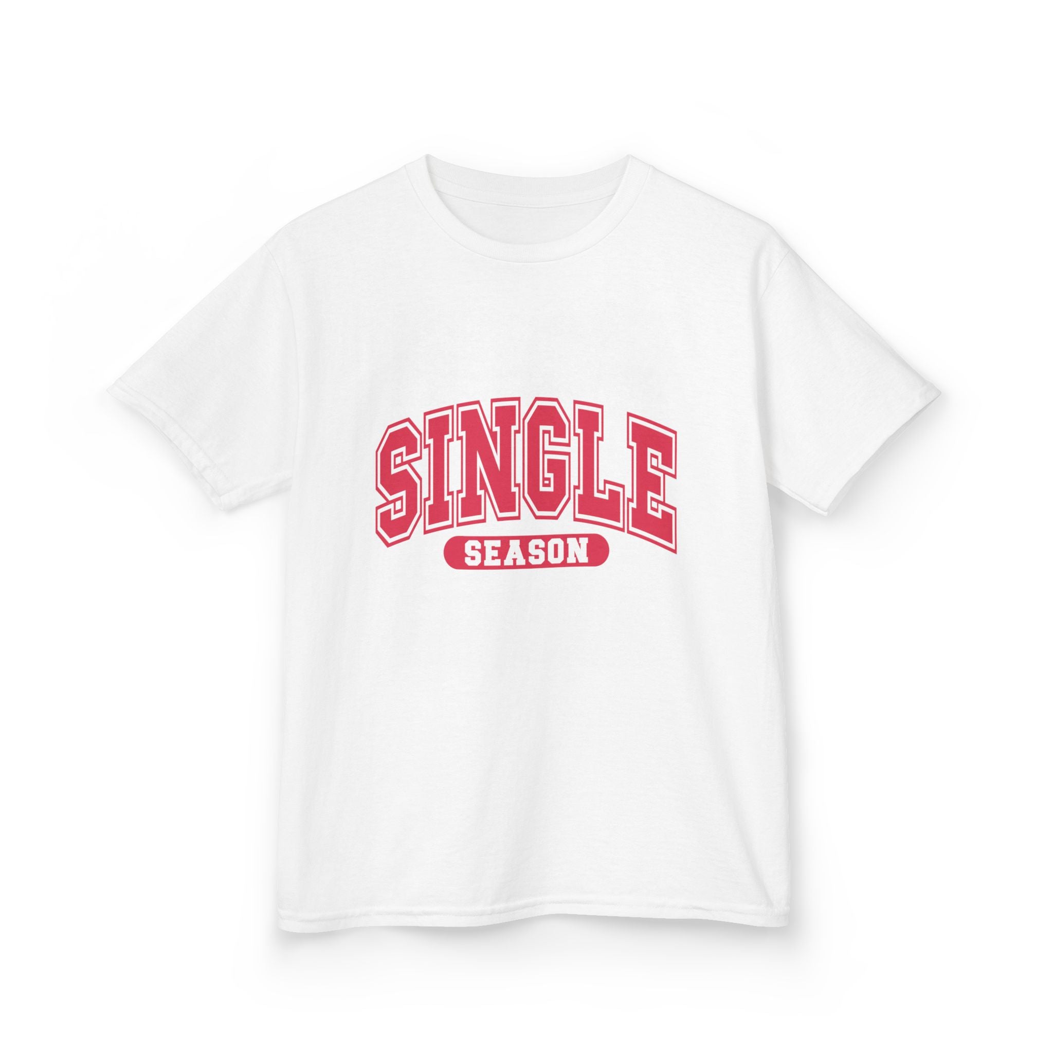 This soft midweight tee carries a playful, confident vibe for kids who love bold graphics and cheeky charm. The arched “SINGLE” lettering with a contrasting banner reads like a varsity crest — energetic, bright, and a little sassy. Lightweight enough for playground summers, sturdy enough for everyday wear, it layers under hoodies or stands alone as a statement. The crew neck and classic fit keep movement free and comfortable, while the clean white canvas makes the pink-red print pop. It’s the kind of shirt that sparks smiles and starts conversations at school, family outings, or casual weekend moments.