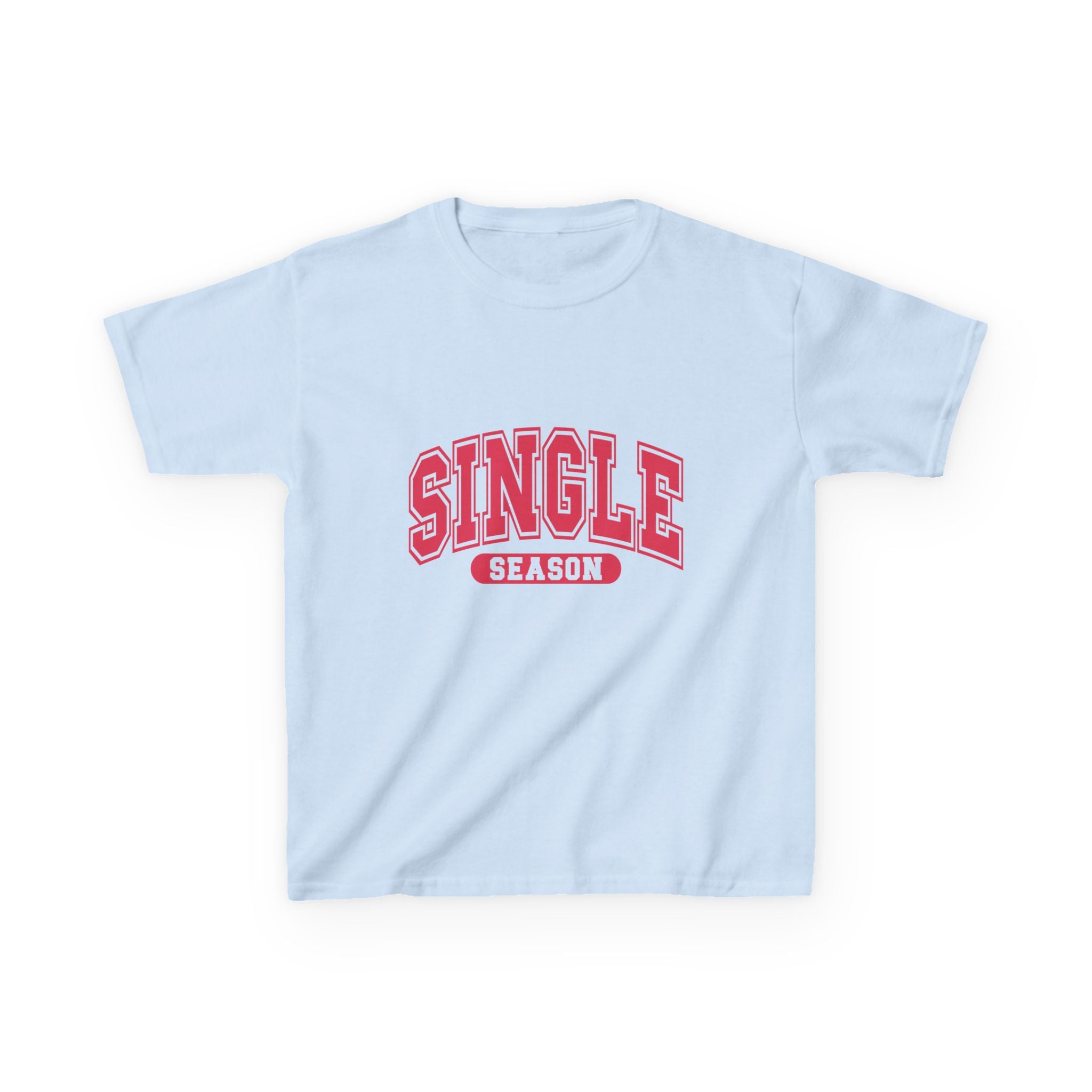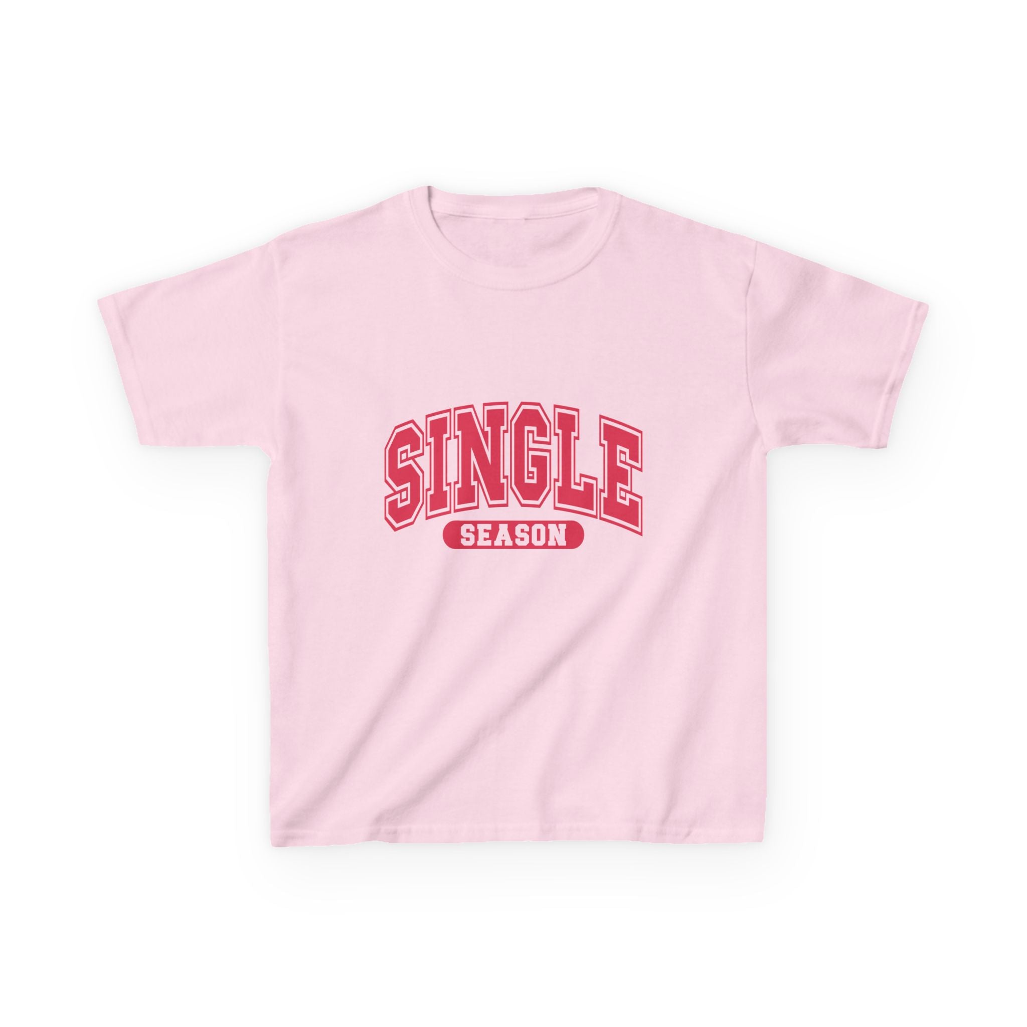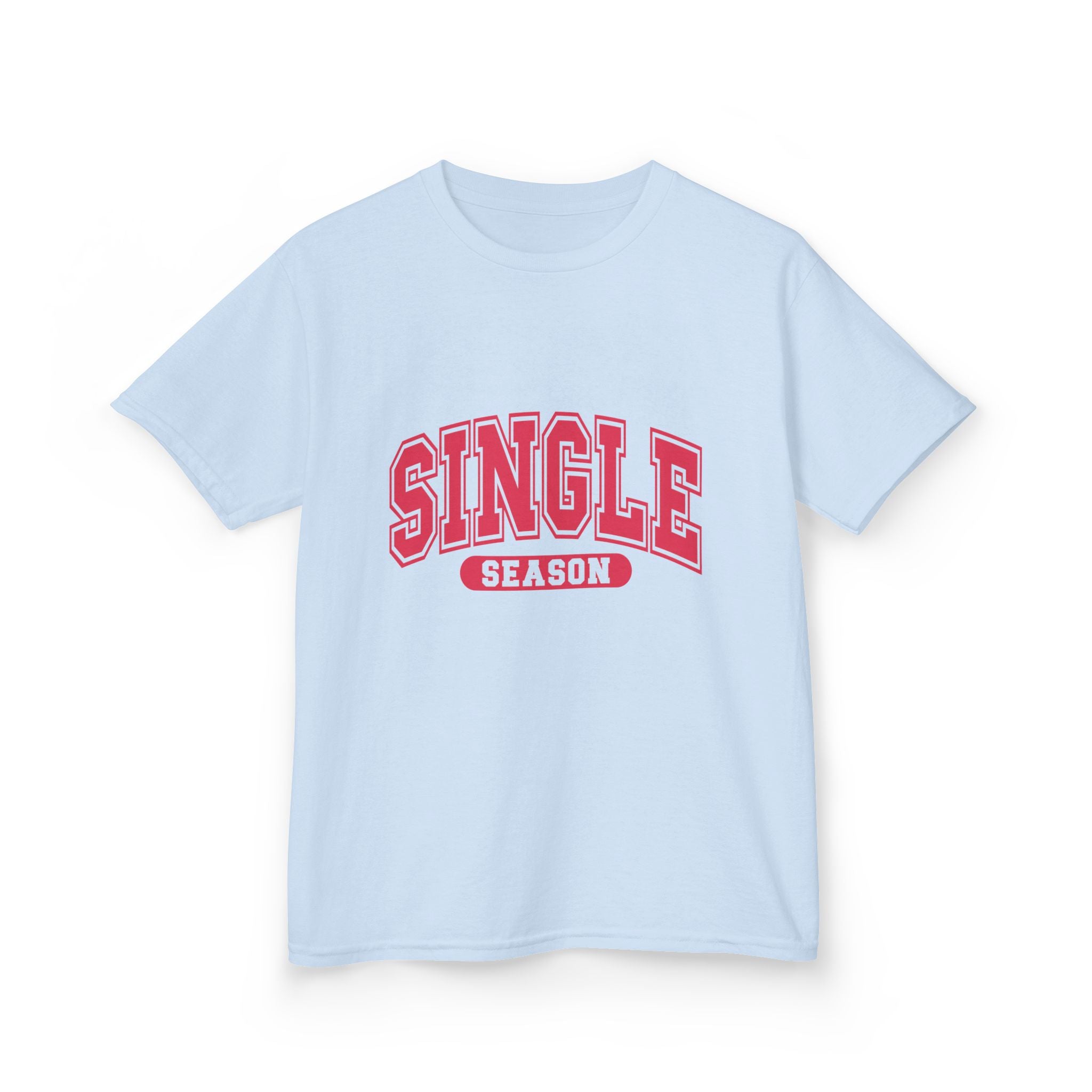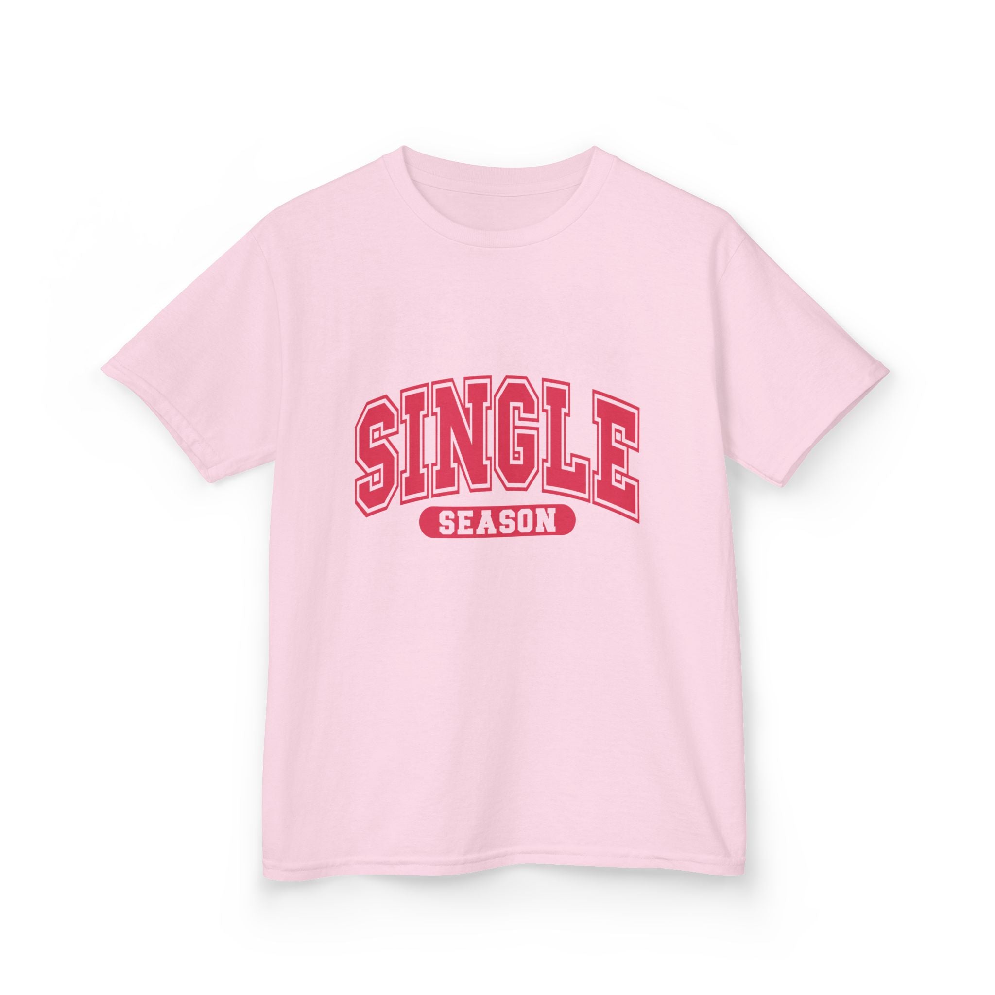 This soft midweight tee carries a playful, confident vibe for kids who love bold graphics and cheeky charm. The arched “SINGLE” lettering with a contrasting banner reads like a varsity crest — energetic, bright, and a little sassy. Lightweight enough for playground summers, sturdy enough for everyday wear, it layers under hoodies or stands alone as a statement. The crew neck and classic fit keep movement free and comfortable, while the clean white canvas makes the pink-red print pop. It’s the kind of shirt that sparks smiles and starts conversations at school, family outings, or casual weekend moments.