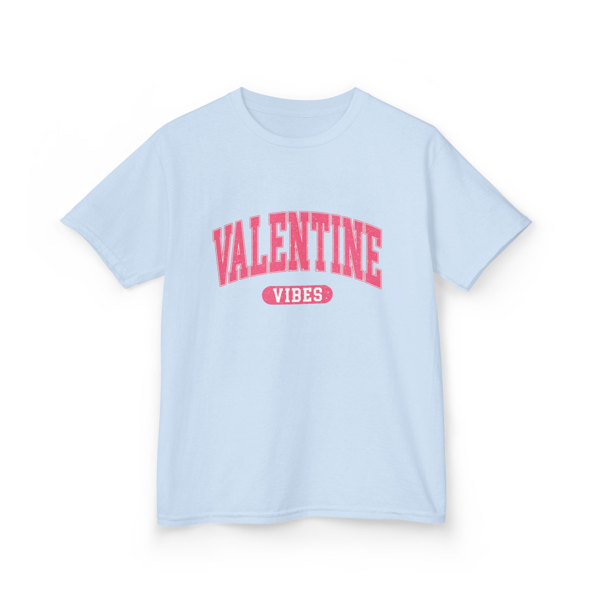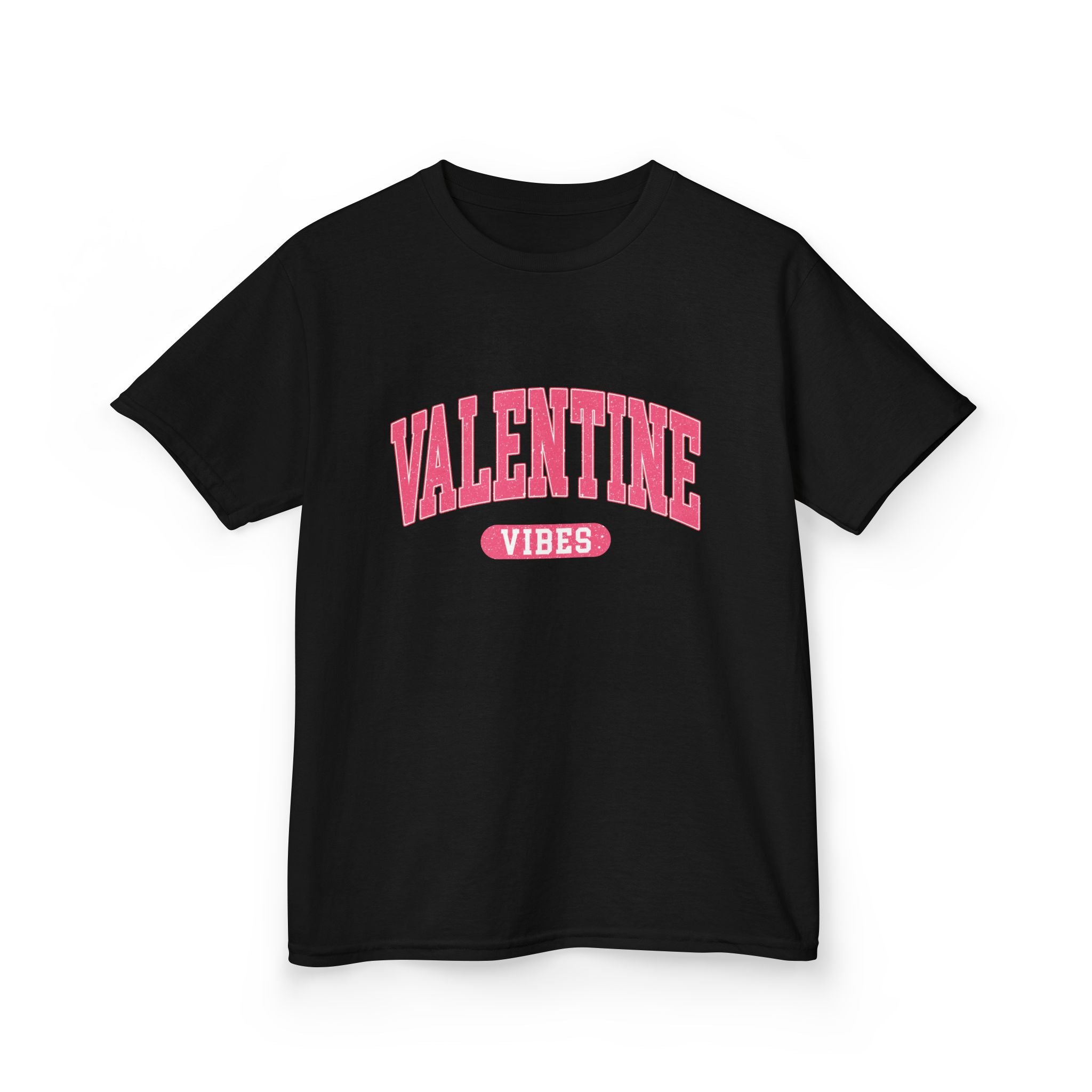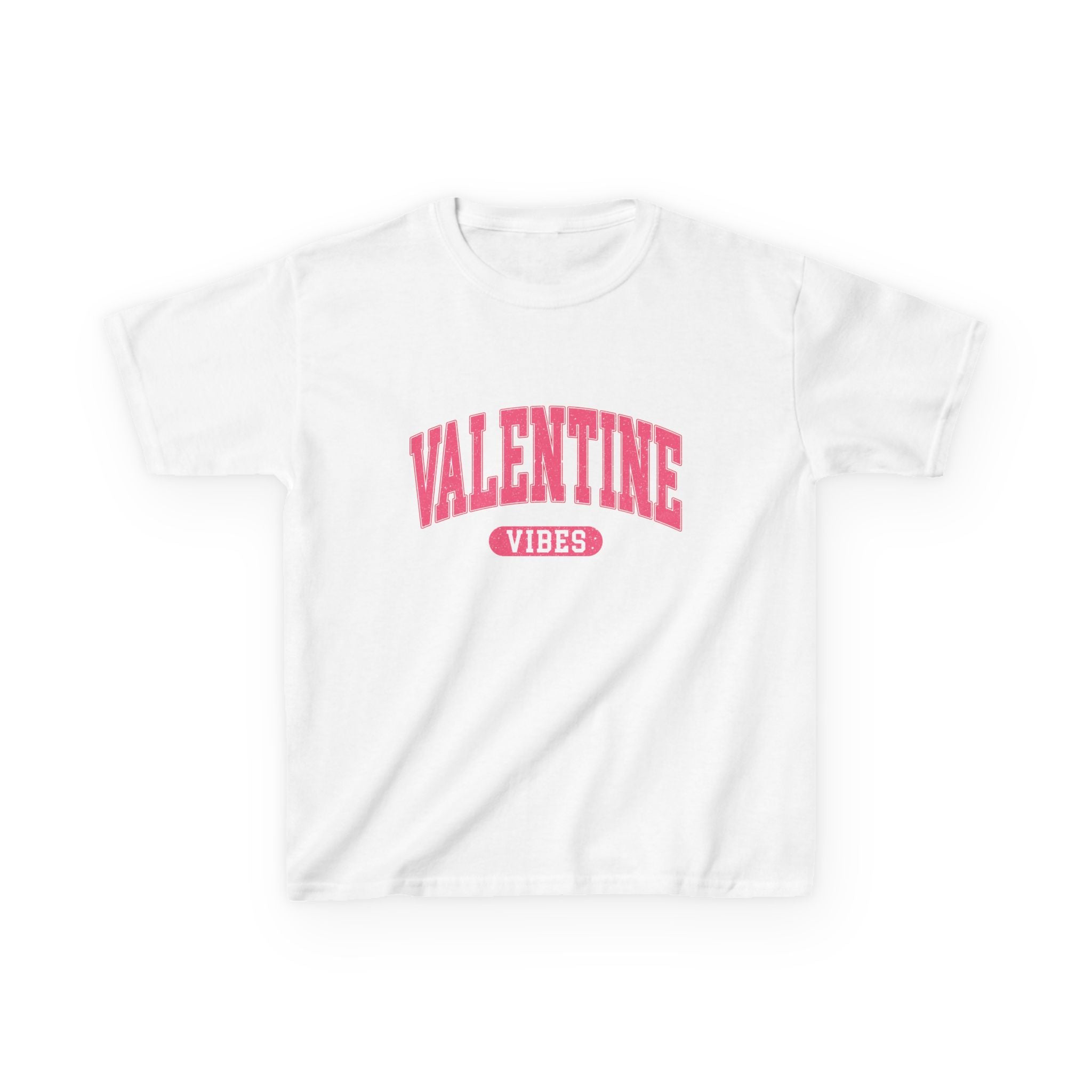 A soft, midweight kids tee with cheerful Valentine energy. The clean white canvas showcases a bold, arching pink ‘VALENTINE’ across the chest with a small ‘VIBES’ badge underneath — playful and simple, made to be worn on school days, holiday parties, or cozy family outings. Its classic crew neckline and straight cut give an easy, comfortable fit that lets little ones move freely while the ribbed collar and shoulder tape keep the shape after many washes. The gentle cotton hand and tear-away label make it comfortable for sensitive skin, while the durable print holds up to playtime and repeated wear.