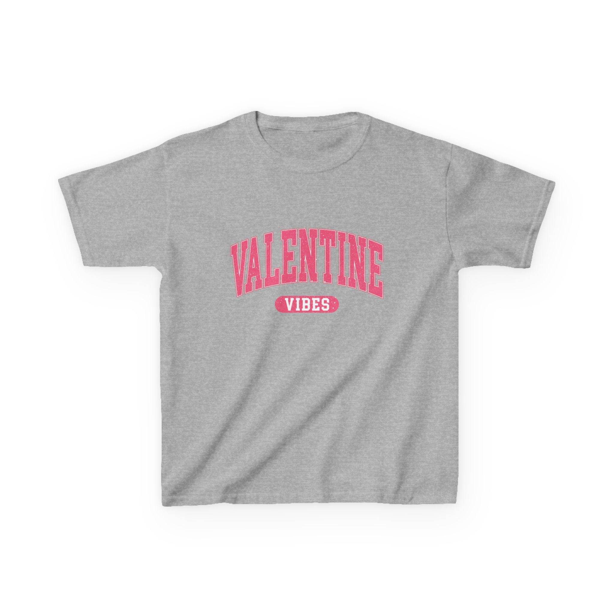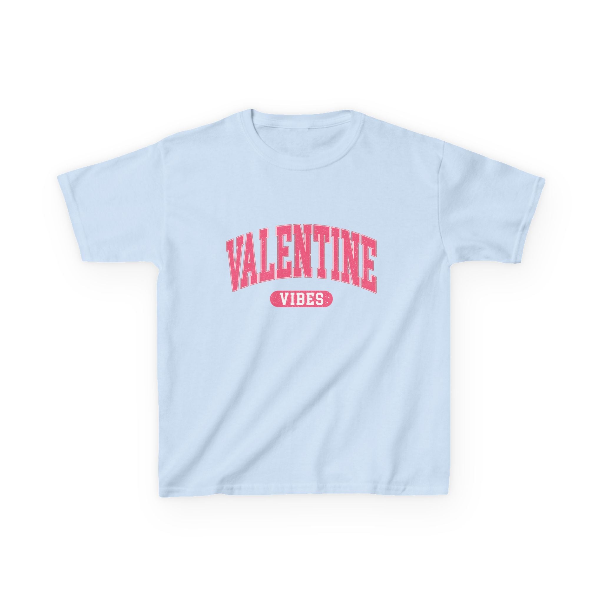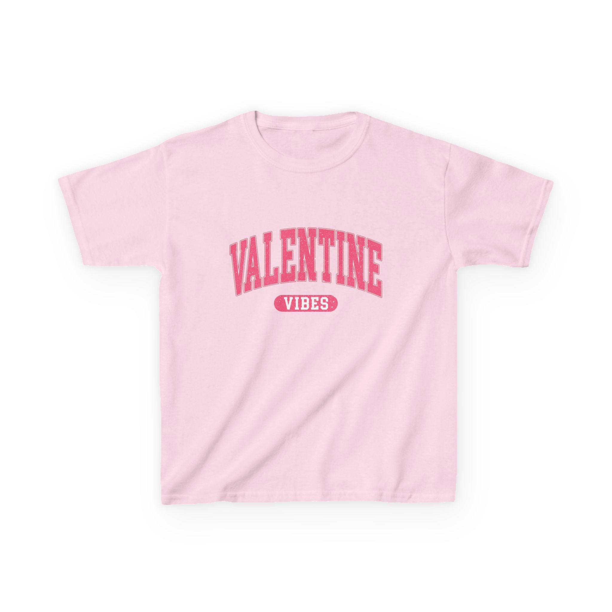 A soft, midweight kids tee with cheerful Valentine energy. The clean white canvas showcases a bold, arching pink ‘VALENTINE’ across the chest with a small ‘VIBES’ badge underneath — playful and simple, made to be worn on school days, holiday parties, or cozy family outings. Its classic crew neckline and straight cut give an easy, comfortable fit that lets little ones move freely while the ribbed collar and shoulder tape keep the shape after many washes. The gentle cotton hand and tear-away label make it comfortable for sensitive skin, while the durable print holds up to playtime and repeated wear.